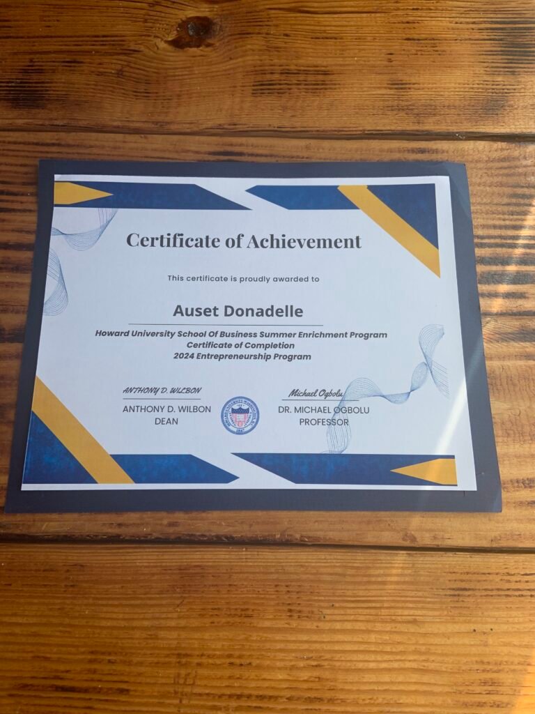 - Certificate of Achievement – 2024 Entrepreneurship Program – Howard University School of Business